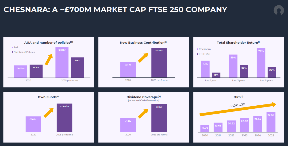 The five-year transformation in one slide. AUA from £8.5 billion to over £20 billion. Dividend coverage from sub-1.0x to approximately 1.5x pro-forma. Total shareholder return of 75% over five years versus 27% for the FTSE 250. And the dividend per share line that has never gone down. This is the slide management shows last before Q&A. Now let me show you what it does not include. (Source: Chesnara FY2025 Investor Presentation)