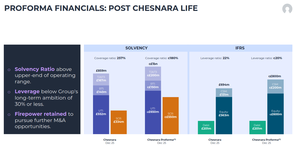 I want to be intellectually honest here. The 257% is optically inflated by pre-acquisition capital raises. On a pro-forma basis including HSBC Life (UK), the ratio moderates to approximately 180%, still 20 percentage points above the top of Chesnara's stated 140% to 160% operating range. Including Scottish Widows Europe, the pro-forma ratio remains at approximately 173%, and management expects own funds to grow to approximately £1 billion on a pro-forma basis.