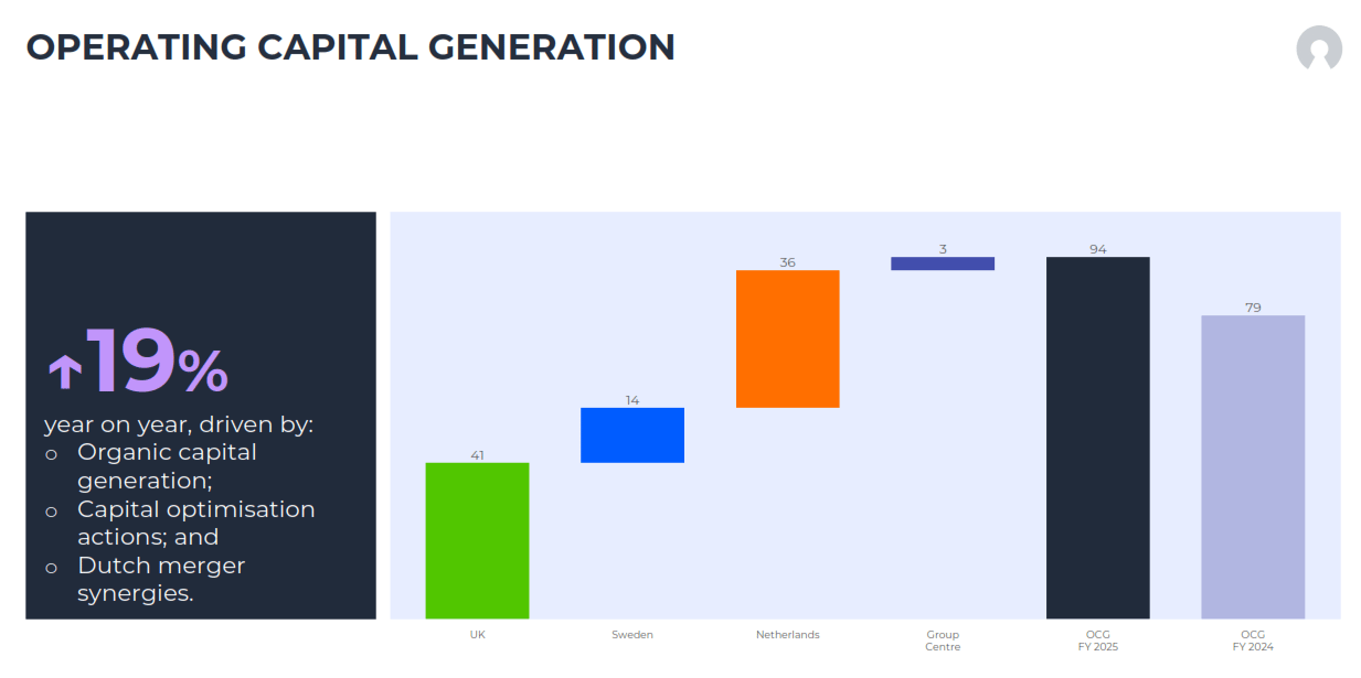 The Netherlands contributed £36 million of OCG, more than Sweden and nearly as much as the UK. The Dutch merger synergies are already visible. Note that these figures exclude any contribution from HSBC Life, which only completed in January 2026. (Source: Chesnara FY2025 Investor Presentation)
