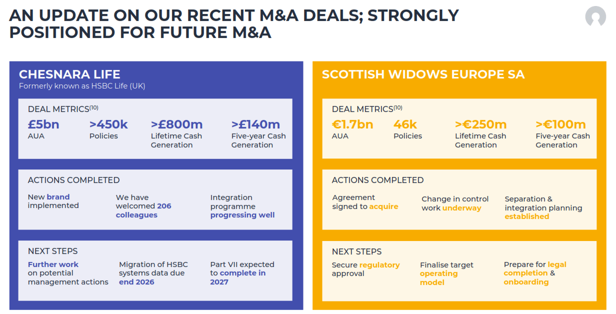 But here is what makes me sit up. Panmure Gordon analyst Abid Hussain suggested on the earnings call that, on his numbers, dividend cover could reach approximately two times by 2028. The reason is that HSBC Life (UK), which was only completed in January 2026, will begin contributing OCG from FY2026 onwards. Management has guided that HSBC Life alone is expected to generate over £800 million in incremental lifetime cash generation, with more than £140 million of that anticipated in the first five years. The Scottish Widows Europe acquisition adds a further €250 million of lifetime cash generation, with approximately €100 million in the first five years.