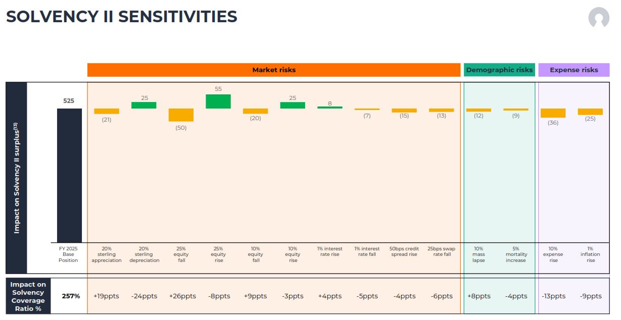 The sensitivity chart from the FY2025 investor presentation makes the fragility more concrete. A 25% equity fall would cost £50 million of surplus and 24 percentage points of solvency ratio. A 50 basis point credit spread widening costs £15 million and 4 percentage points. A 1% interest rate fall costs £7 million and 5 percentage points. A 10% mass lapse event costs £12 million. And a 10% expense rise (not implausible if integration costs overrun) costs £36 million and 13 percentage points. On the 173% pro-forma base, a severe but plausible combined stress scenario (equity correction plus credit spread widening plus expense overrun) could bring solvency uncomfortably close to the 140 to 160% operating range. The buffer is real, but it is not infinite.
