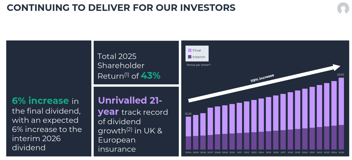 From 10.29p in 2004 to 22.50p in 2025, a 119% increase over 21 unbroken years. The bear will point out that the FY2024 bar required rebasing after the rights issue. The bull will point out that the arrow still goes up and to the right. Both are correct. (Source: Chesnara FY2025 Investor Presentation)
